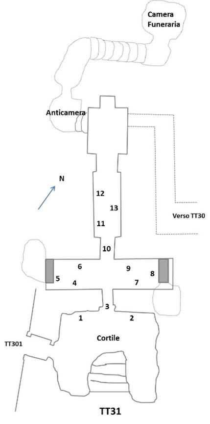 - nicchia/cappella[29]: scoperta, perché murata, solo durante i lavori di consolidamento e restauro del 1925, presenta i dipinti parietali più belli e meglio conservati della TT31.