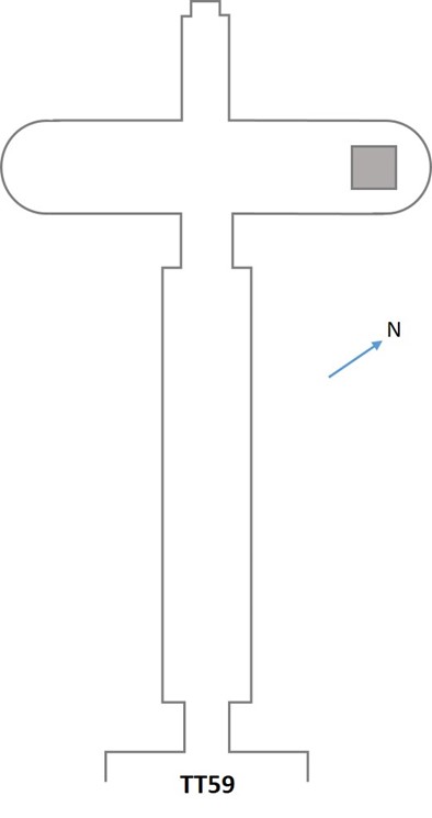 Al contrario di altre tombe di analogo periodo a forma di “T” rovesciata, la TT59 si sviluppa, subito dopo un breve corridoio di ingresso, in una lunga camera che termina in un corridoio trasversale che presenta i lati corti arrotondati. Per questa particolare conformazione, che richiama la forma delle tombe degli inizi della XVIII dinastia e segnatamente quella di Thutmosi III, si è ritenuto che a tale periodo sia ascrivibile questa tomba.
