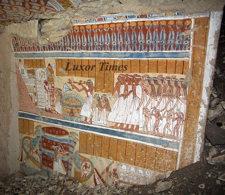 Nel registro inferiore la barca che trasporta il catafalco con i resti mortali del defunto e la moglie in lacrime, che viene trainata da un’imbarcazione più piccola fin sulla riva occidentale del Nilo.