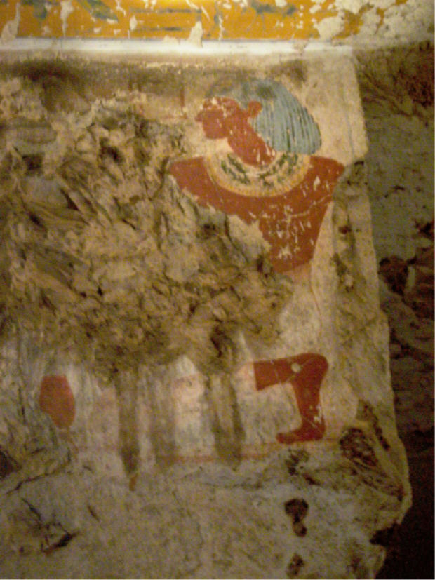 Pochi resti, inoltre, di testi sacri e dedicatori. Un lungo corridoio, privo di rilievi e dipinti, e in cui è possibile solo leggere alcuni testi relativi ai genitori, dà accesso ad una camera il cui soffitto è sorretto da quattro colonne. Sul fondo tracce di scavo probabilmente in previsione di un ampliamento della tomba.