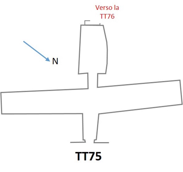 Un breve corridoio, sulle cui pareti è rappresentato il defunto nell’atto di abbandonare la tomba per “ammirare Amon nel suo sorgere”, dà accesso ad una camera asimmetrica in cui, due scene rappresentano il corteo funebre e un pellegrinaggio ad Abydos; un’altra scena rappresenta l’offertorio di alcuni preti al defunto e alla moglie. Sul fondo della camera, una breccia adduce alla TT76.