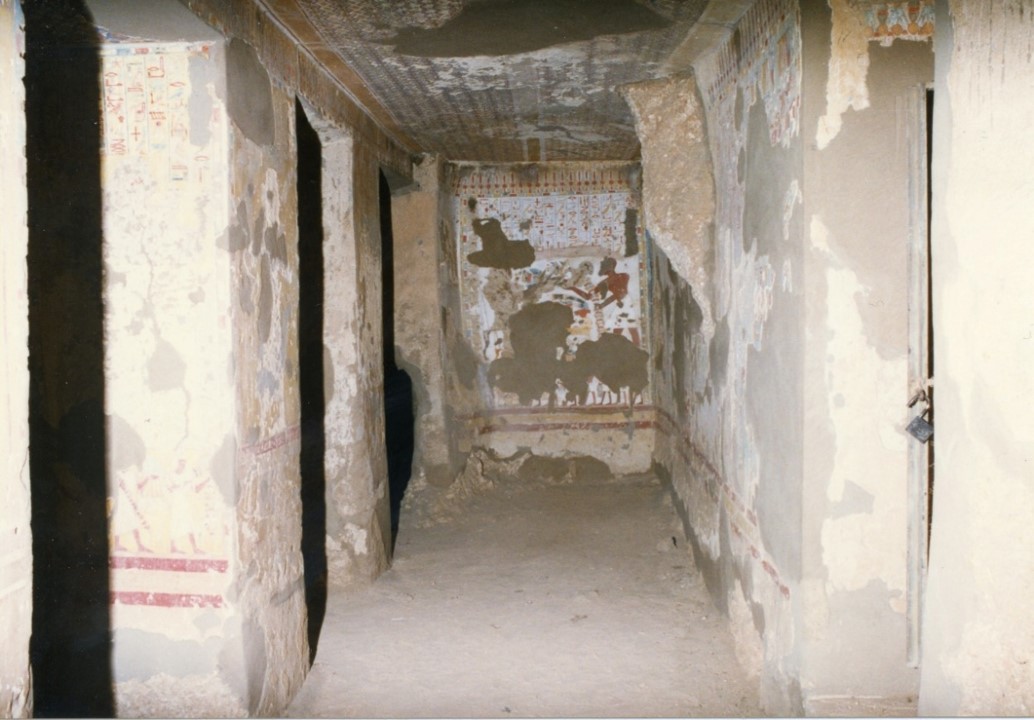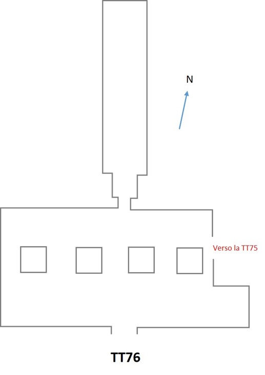 Un breve corridoio dà accesso ad un’ampia sala con quattro pilastri. Al contrario di quanto avviene in gran parte della tombe del periodo, non esiste corridoio trasversale. Nell’angolo est della sala, si apre un accesso alla TT75.