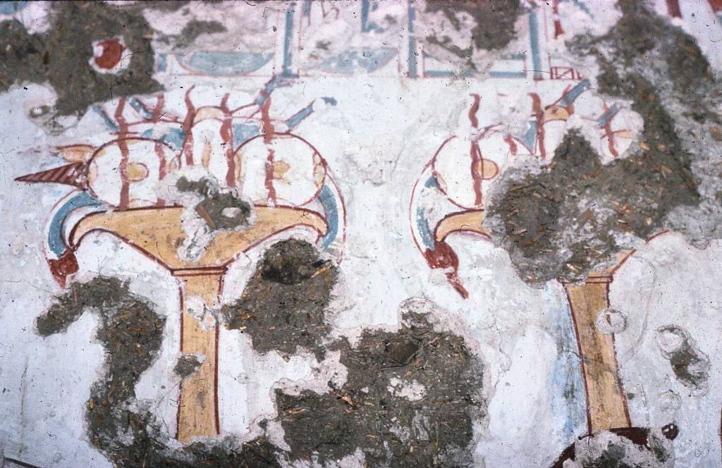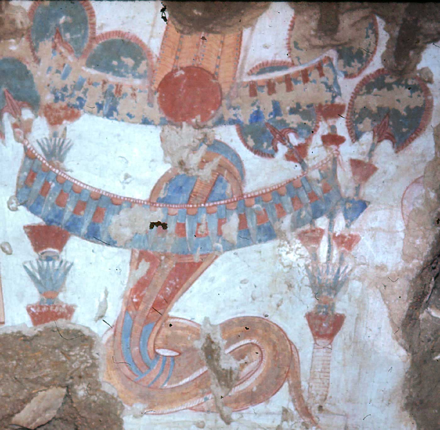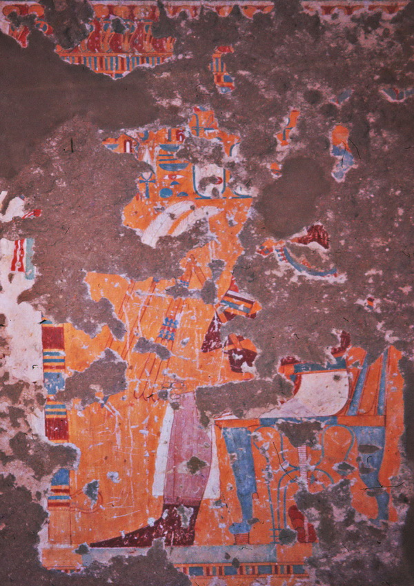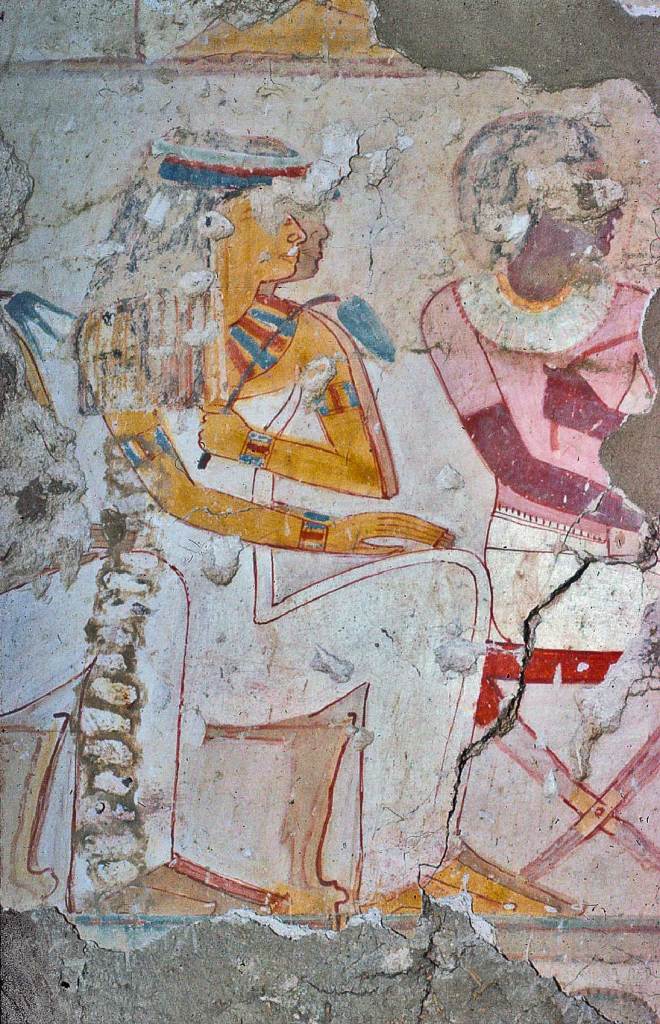 Poco discosto, due preti in offertorio alla coppia. In un’altra scena il defunto, e altri uomini, recano doni al Tempio di Amon e al faraone Thutmosi IV, seduto sotto un padiglione.