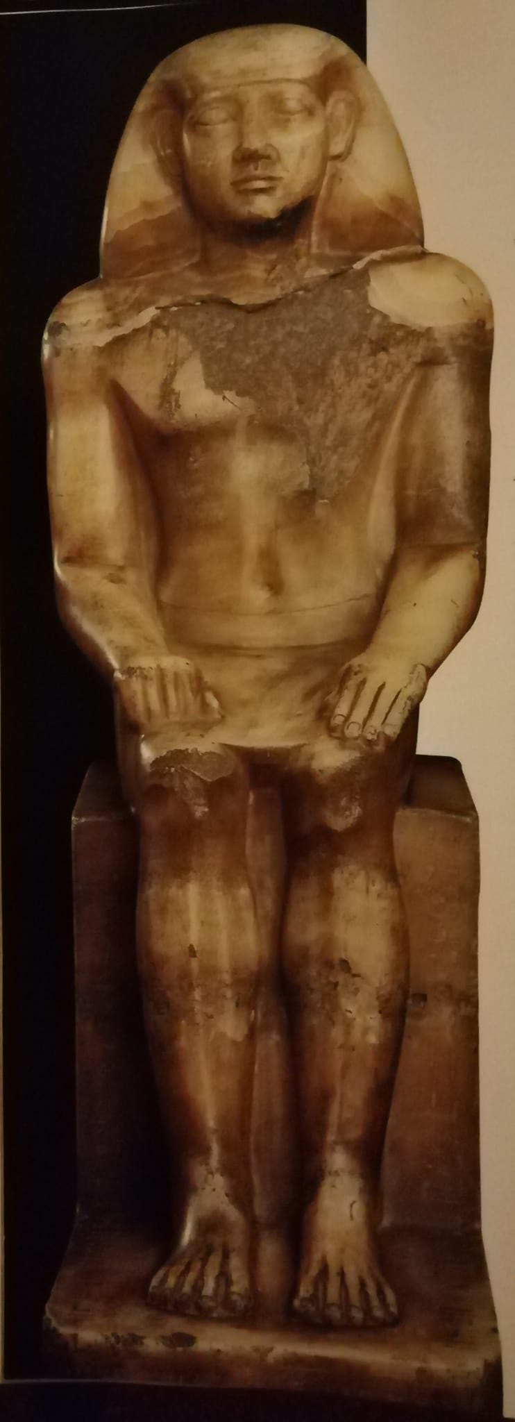 Questa maestosa scultura in Alabastro raffigura un Petamenofi, un funzionario, raffigurato seduto su un seggio cubico con base anteriore, le mani sono appoggiate sulle ginocchia, la sinistra con il palmo rivolto verso il basso, la destra chiusa a pugno.