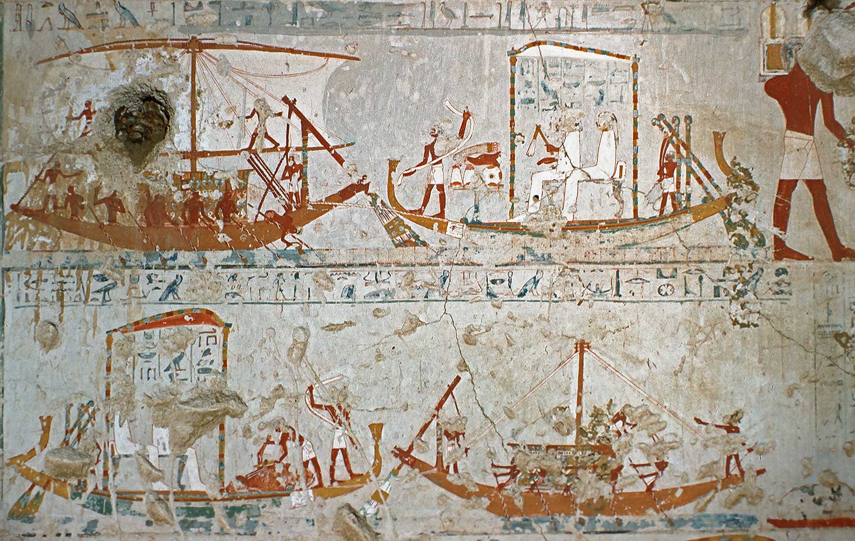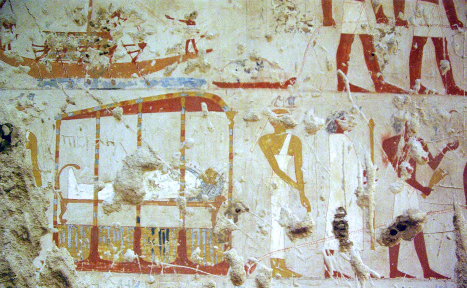 Su altra parete (6), il defunto in offertorio al visir Aamtju Ahmose e sua moglie; seguono (7) scene di caccia del defunto e della moglie alla gazzella nel deserto e all’ippopotamo (8), nonché scene di pesca e di uccellagione e testi magici.