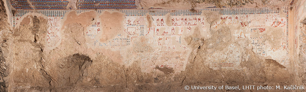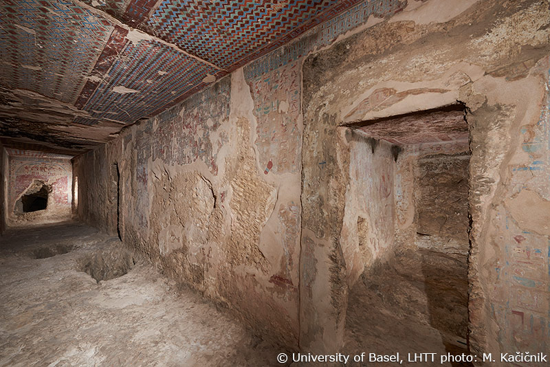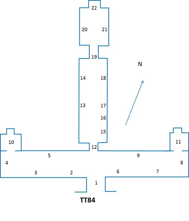 Un ulteriore corridoio (19) dà accesso ad una cappella finale sulle cui pareti sono rappresentati (20, dipinto non ultimato) il defunto e la moglie in offertorio e (21) il defunto e un altro uomo anch’essi in atto di offrire libagioni verso la nicchia di fondo (22) in cui è rappresentato Anubi.