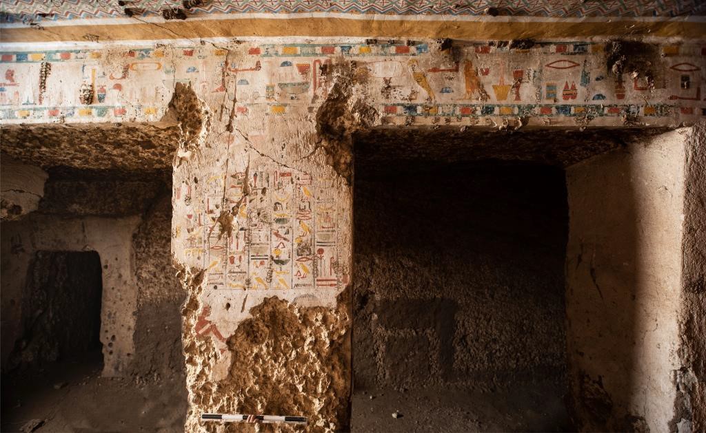 Solo la parete a destra dell’ingresso presenta alcune scene parietali: il defunto in atto di offertorio ad Amon-Ra; alcuni uomini in atto di offertorio al defunto e alla madre; alcuni uomini che portano gazzelle e pani; sul lato corto adiacente la parete una stele, non terminata, con scena del defunto in offertorio a Osiride.