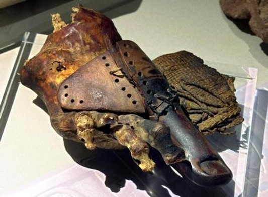 [9] La protesi della TT95 è in legno e cuoio; un’altra protesi di piede, risalente verosimilmente al Nuovo regno, si trova presso il British Museum (cat. BM EA29996). E’ in cartonnage e non può ascriversi pienamente tra le protesi poiché, molto verosimilmente, non era destinata alla deambulazione (come quella sopra presentata), ma solo a riempire esteticamente un’amputazione per una mummia. Pare infatti difficile, essendo in cartonnage (lino e colla), senza articolazioni e senza altre dita, che la “protesi” del British Museum potesse garantire una deambulazione “normale”: in fase di avanzamento del passo, infatti, la sporgenza costituita dall’alluce di “cartapesta” non avrebbe agevolato la camminata, ed anzi l’avrebbe non poco intralciata.
