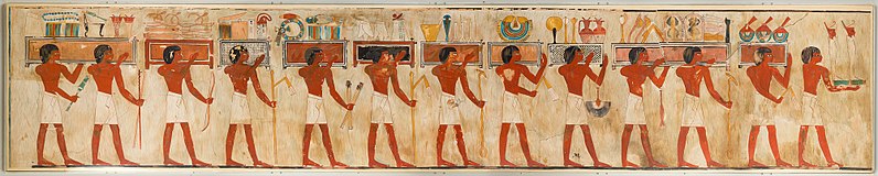 [21] Le cosiddette “processioni egee”, o “dei tributi stranieri”, o “processioni Keftiw”, si ripetono in altre cinque tombe dei nobili oltre la TT100, tutte concentrate nella XVIII dinastia e in un arco temporale di circa 100 anni: TT39, di Puyemra, Secondo Profeta di Amon durante il regno di Thutmosi III; TT71, di Senenmut, architetto durante il regno di Hatshepsut; TT86, di Menkheperreseneb Primo Profeta di Amon sotto Thutmosi III; TT131, di Useramon Visir di Thutmosi III; TT155, di Intef Grande araldo del re sotto Thutmosi III.