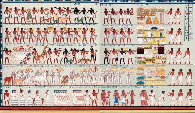 - 3° registro: Nubiani con animali dell’Africa equatoriale (giraffe, leopardi, babbuini, scimmie,), buoi, cani, zanne d’elefante e pelli conciate;