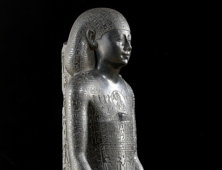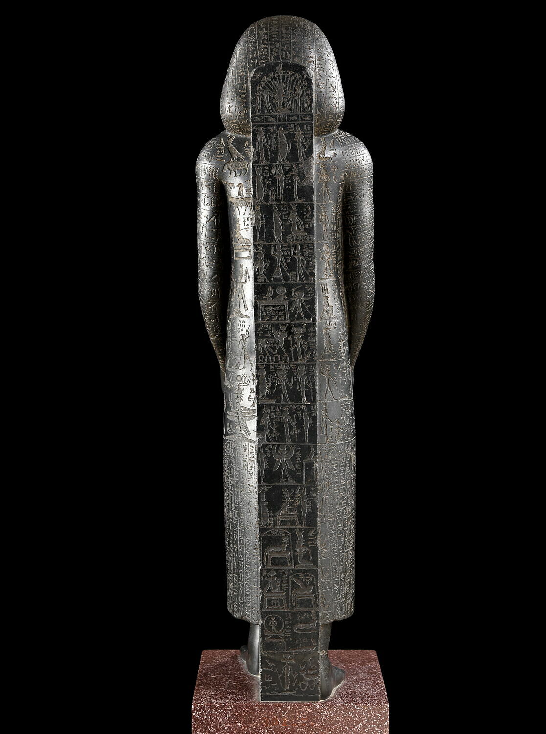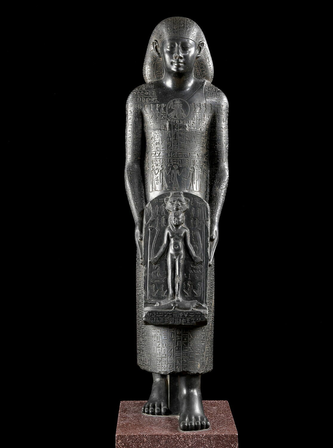 In questo caso la statua regge tra le mani una stele apotropaica con la raffigurazione di Horus come dio-fanciullo che scaccia il male (una cosiddetta STELE DI HORUS SUI COCCODRILLI).