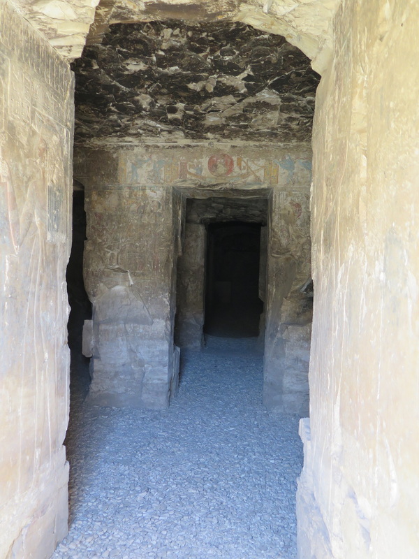 Un corridoio, sulle cui pareti (13) è rappresentato il defunto seduto, dà accesso ad una sala perpendicolare alla precedente, con soffitto sorretto da sei pilastri di cui solo due decorati: