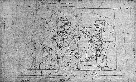 Scena di banchetto con un figlio, e un nipote, che offrono un mazzo di fiori al defunto; appena abbozzati e non ultimati, poco distanti, riti propiziatori su statue. Altro dipinto parietale ugualmente di banchetto del defunto e della moglie in presenza di musicisti (arpisti maschi e suonatrici di tamburello) e ospiti.