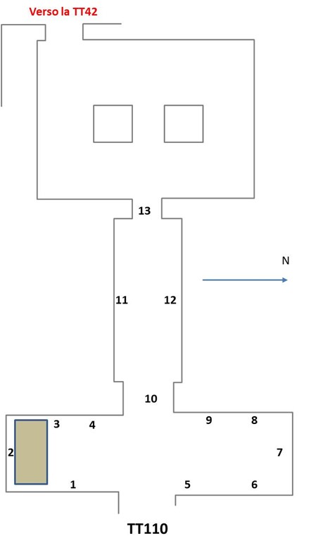 Un breve corridoio, sulle cui pareti (10) sono riportati testi dedicatori a Thutmosi III, adduce alla camera perpendicolare. Qui, su quattro registri sovrapposti (11), il corteo funebre e il defunto che offre libagioni a Osiride; sulla parete opposta (12) il defunto ispeziona i portatori di offerte e una processione con suonatori di tamburo e di liuto. Un altro corridoio (13) con resti di testi sacri, dà accesso ad una sala pressoché quadrata con soffitto sorretto da due pilastri.