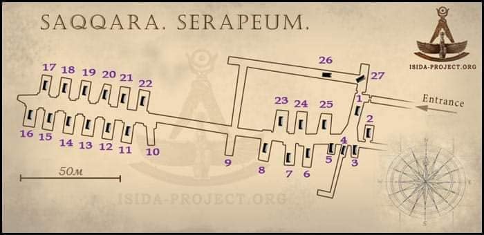 Il Serapeo è una catacomba, scavata nella roccia calcarea di Saqqara, che si svolge sotto terra per circa 300 metri, più le cappelle laterali.