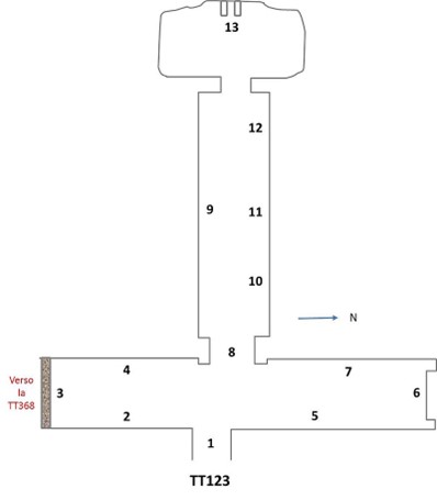La TT123 si sviluppa planimetricamente con forma a “T” rovesciata tipica delle sepolture di questo periodo. Un breve corridoio, sulle cui pareti (1 in planimetria[5]) sono rappresentati il defunto seduto, liste delle offerte e inni a Ra, dà accesso ad una sala trasversale con resti di scene (2) di un uomo in presenza di Thutmosi III seguite, su una tamponatura oltre la quale si trova la TT368, dai resti di una stele (3) con i cartigli dello stesso faraone. Seguono (4) brani dal Libro dei morti con preti che presentano una lunga lista di offerte rituali; poco oltre (5) il defunto e la sua famiglia a pesca e a caccia, e mentre eseguono un censimento del bestiame tra cui tori con corna decorate; il defunto (7) a caccia di ippopotami mentre la moglie riceve offerte dalle terre paludose del Delta nilotico. Sulla parete più corta (6) i resti illeggibili di una stele testuale.