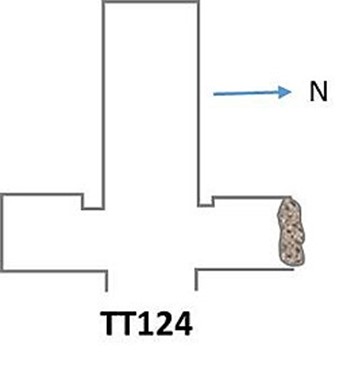La TT124 si sviluppa planimetricamente con forma a “T” rovesciata tipica delle sepolture di questo periodo. Un breve corridoio dà accesso alla sala trasversale sulel cui pareti sono ancora leggibili solo due dipinti: in uno, su quattro registri sovrapposti, il corteo funebre e preti che officiano riti presentando liste di offerte; in un altro il defunto e la moglie seduti, con uno specchio sotto la sedia della donna.