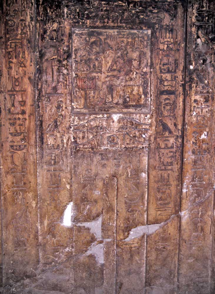 Una falsa porta (4) alla cui sommità sono rappresentati il defunto e Tetisonb, mentre sui ritti portatori di offerte; poco oltre (5) il defunto e Tetisonb seduti dinanzi a un’altra coppia mentre preti offrono libagioni e (6) il defunto riceve prodotti tipici del Fayyum.