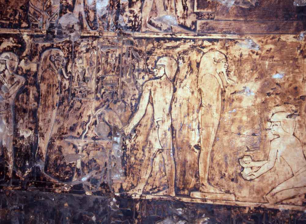 Sul lato corto della sala (9) una stele con “ammonimenti ai viventi” e testi autobiografici; poco oltre (10) il defunto e il padre ispezionano portatori di bestiame e pollame e assistono alla cattura di oche, asini, gru. Ultimo rilievo della sala trasversale (11) rappresenta il defunto con una moglie a pesca e scene di vendemmia.