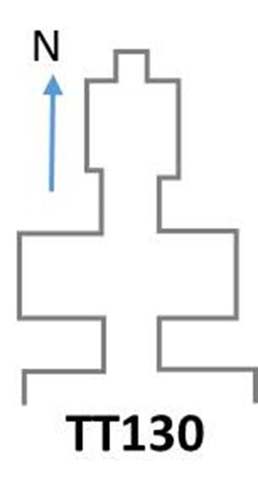 La TT130 segue lo schema planimetrico tipico delle tombe del periodo a “T” rovesciata; da un cortile, un corridoio adduce ad una sala trasversale sulle cui pareti il defunto e la moglie sono in offertorio. Poco discosto, una stele in cui il defunto e la moglie adorano Osiride e Anubi; scene molto danneggiate di due uomini che offrono libagioni al defunto e alla moglie e, su tre registri sovrapposti (non ultimati), rituali funebri sulla mummia. Un dipinto rappresenta una donna in offertorio al defunto e alla moglie che, a loro volta, adorano la dea Hathor in presenza di un gruppo di musiciste (arpiste, liutiste, cantanti e suonatrici di tamburello).