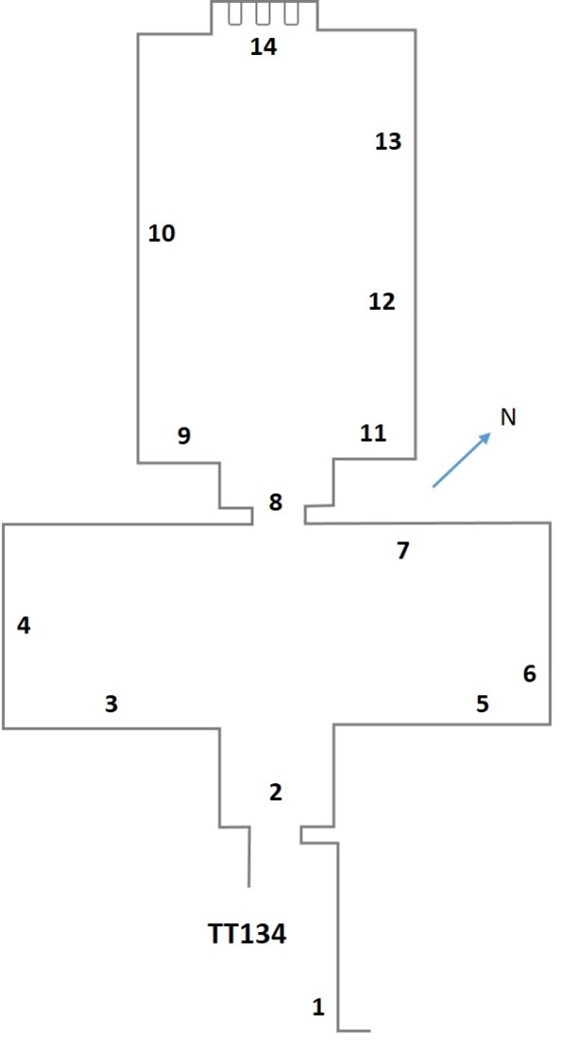 L’accesso alla TT134 si trova in un cortile, da cui si accede anche alla TT53, in cui (n. 1 in planimetria[5]) una stele, su tre registri sovrapposti, reca la barca di Amon trainata da sciacalli, inni dedicati ad Amon-Ra e il defunto e la moglie dinanzi a Ra-Horakhti, Atum, Iside, Osiride e Hathor. Un corridoio, sulle cui pareti (2) sono riportati i cartigli di Amenhotep I e della regina Ahmose Nefertari, adduce ad una sala trasversale, nella forma planimetrica tipica delle tombe del periodo a “T” rovesciata, sulle cui pareti (3-4) brani del Libro delle Porte, una barca trainata verso il tempio di Busiris attesa sulla riva da donne con sistri. Su altre pareti (6-7) i resti di una donna e un uomo, inginocchiati, in offertorio al defunto e alla moglie.