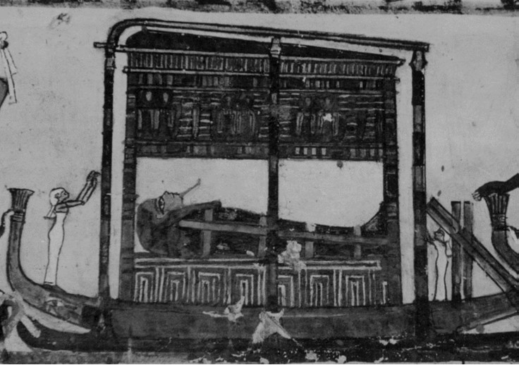 Su quattro registri sovrapposti (4), il defunto e la moglie con file di portatori in offertorio a Osiride, scene della processione funebre con il trasporto del sarcofago e delle suppellettili funerarie, il rito dell’apertura della bocca officiato da due preti sulla mummia e il pellegrinaggio ad Abydos.