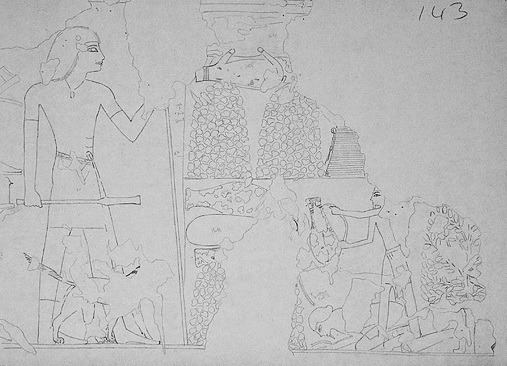 Dall’altro lato della porta di accesso, su sei registri sovrapposti, scene di lavoro agricolo compresa la pesatura del raccolto, uno scriba che annota le operazioni e alcuni uomini con cavalli.