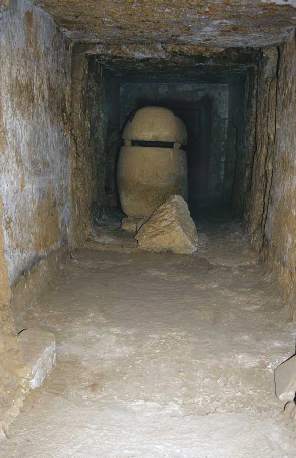 Dalla camera longitudinale, un passaggio in discesa adduce all’appartamento sotterraneo che presenta numerose camere funerarie, non decorate, in cui si trovano due sarcofagi in arenaria e tre in granito. Le camere funerarie non vennero realizzate contestualmente allo scavo di TT148, ma mano a mano che se ne rendeva necessario lo scavo per seppellire familiari del titolare. Il passaggio dalla sala longitudinale, verso ovest, è ampio circa 2 mq e scende per 31,65 m fino a raggiungere la camera funeraria principale in cui si apre l’accesso ad un’altra camera funeraria; lungo il corridoio si aprono 4 camere funerarie secondarie[20]. Dal corridoio longitudinale, in direzione opposta al corridoio discendente di cui si è detto, si apre un altro corridoio discendente, che forse doveva essere l’inizio di altre sepolture, di circa 8 m di lunghezza e 1,90 m di altezza nel suo punto massimo.