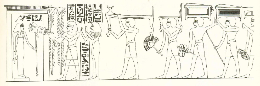 Poco oltre, il figlio Huynefer, Giardiniere delle divine offerte, seguito da fratelli e sorelle, offe mazzi di fiori di Amon ai genitori, una figlia in offertorio ai genitori con un concerto di musici: arpisti e liutisti, fanciulle con arpe da spalla, lire, liuti, doppi flauti e tamburelli; il defunto ispeziona l’irrigazione dei giardini in presenza di alcuni ospiti.