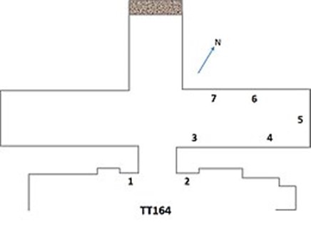 L’accesso a TT164 si apre in un cortile in cui (1 e 2 in planimetria[7]) si trovano due stele con il defunto in adorazione e inni sacri.