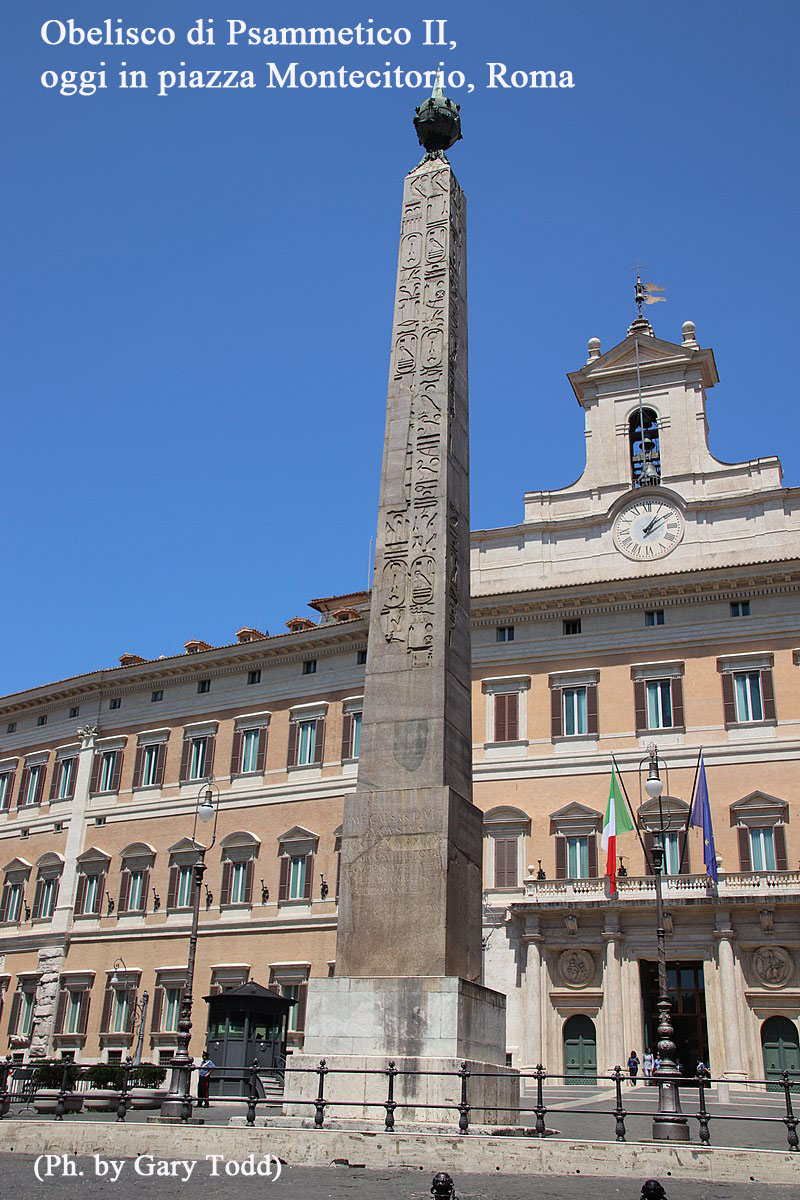 Tra i tredici obelischi presenti a Roma, uno di questi è di Psammetico II; venne fatto trasportare a Roma dall’Imperatore Ottaviano Augusto nel 10 a.C.. Inizialmente collocato in Campo Marzio come gnomone di un orologio solare, tra il IX e l’XI secolo l’obelisco crollò, forse a causa del terremoto dell’849 o in seguito al sacco di Roma del 1084, e progressivamente, si interrò. Sul finire del ‘700 Papa Pio VI lo fece recuperare ed iniziò a farlo restaurare e ad erigerlo come orologio solare. Completamente restaurato venne eretto in Piazza Montecitorio dove si trova attualmente.