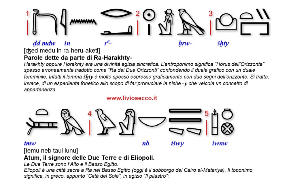 La divinità assisa sulla barca regge sulla testa un surdimensionato disco solare dotato a sua volta di un ureo. La divinità è un sincretismo di Ra, Harakhty (Horus dell’Orizzonte) e Atum. Ricordiamo che il sole nasce come Khepri, trasformandosi in Ra a mezzogiorno e tramontando in qualità di Atum alla sera.