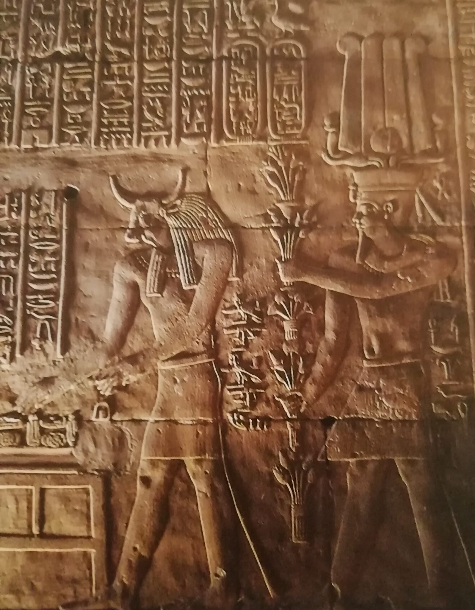Horus e Nekhbet stringono in mano una pannocchia di palma come simbolo dell’infinito successione degli anni.