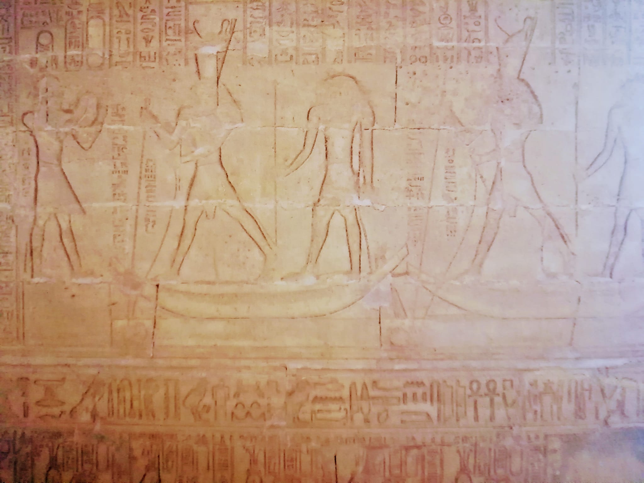 Il santuario sulla destra, che si trova sulla terraferma, riproduce il tempio di Edfu con le sue divinità principali, Horus Behedeti e Ra-Harakhty; quello di destra, che si trova a bordo della barca pronta a salpare, raffigura le stesse divinità, con la differenza che ora Ra-Horakhty è definito “Re dell’Alto e Basso Egitto”.
