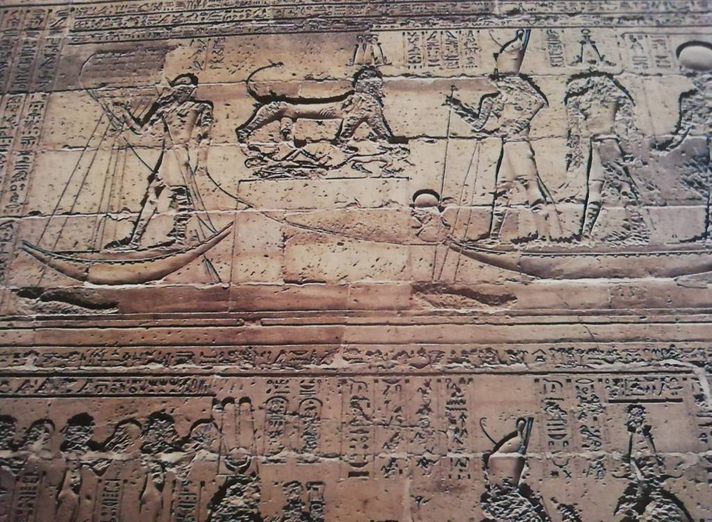 Sulla prua della nave è inginocchiata Iside che partecipa attivamente alla lotta e nel frattempo incoraggia il figlio: “Persevera, Horus! Non fuggire davanti agli animali d’acqua ostili! Non temere i nemici che si trovano tra i flutti. Non cedere, quando lui [Seth] implora la grazia!“