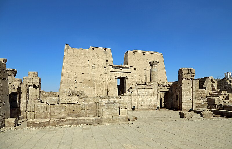 Veduta del cortile e della facciata della sala ipostila del tempio di Horus dà un’idea della grandiosità del tempio. Il cortile è circondato da colonne su tre lati, peristilio, formando così dei portici le cui pareti sono coperte da raffigurazioni: tra le varie quelle delle feste di Horus, in cui la dea Hathor di Dendera faceva visita al dio Horus, è raffigurata la processione di navi che accompagnava la dea