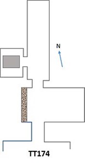 La TT174, non ispezionabile nella sua totalità, si presenta secondo lo schema a “T” capovolta tipico delle sepolture di questo periodo. Gli interni sono pesantemente danneggiati ed è ancora leggibile una sola scena parietale relativa a un banchetto con il figlio Pakhihet, titolare della TT187, con altri fratelli e parenti, in offertorio al defunto e alla madre. In un altro registro ancora visibile, il defunto e il figlio dinanzi a Osiride[8].