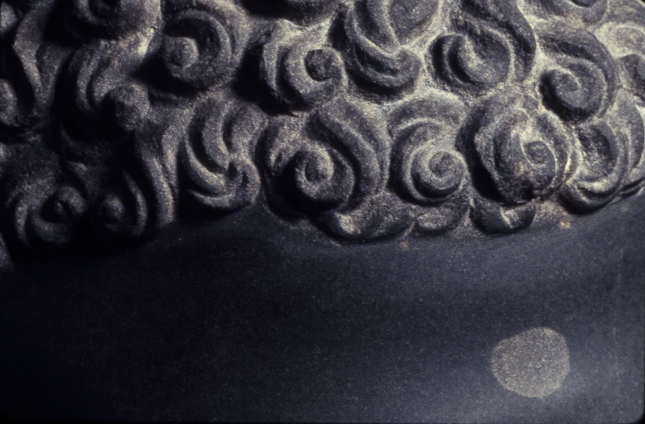Il contrasto fra il viso levigato e i capelli si riscontra in molte statue egizie.