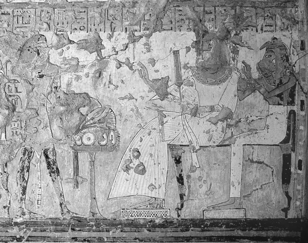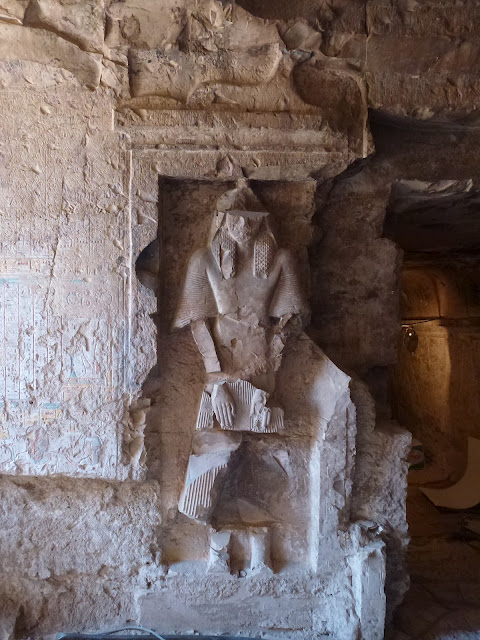 Sulla parete opposta (3) brani del Libro delle Porte, il defunto che adora una divinità e portatori di offerte dinanzi al defunto e alla moglie; in una nicchia (4) una statua.