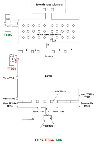 [6] Poiché in planimetria sono rappresentate due differenti tombe, i riferimenti sono stati riportati in differente colore. Per la TT190 seguire la numerazione nera.