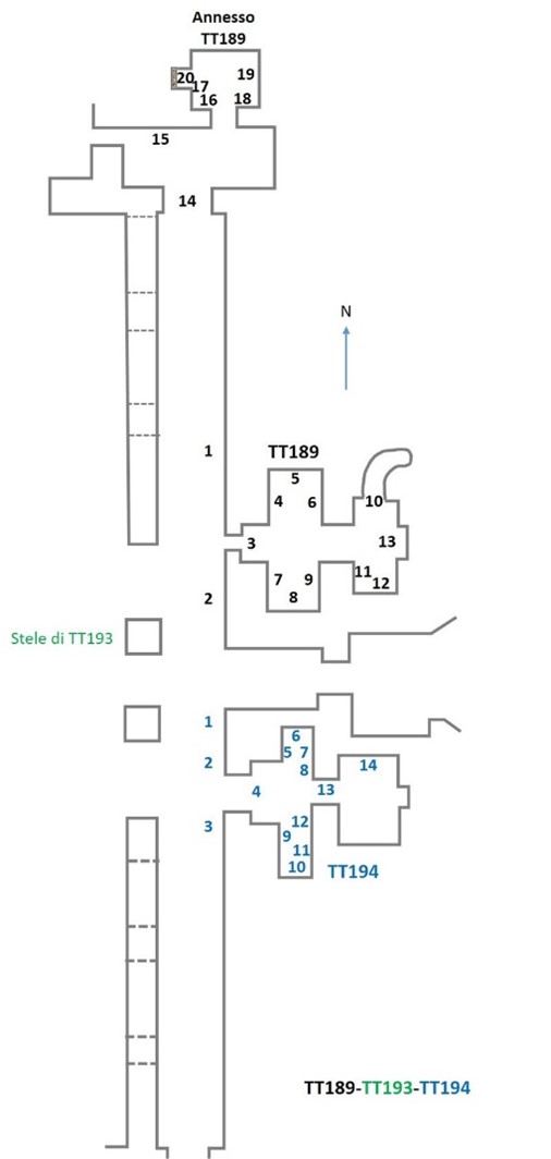 [8] Poichè sull’area insistono tre differenti tombe, i riferimenti sono stati riportati in differente colore. Per la TT194 seguire la numerazione blu.