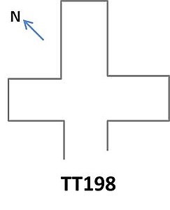 TT198 presenta una semplice planimetria a “T” capovolta, tipica del periodo, con un ingresso, una sala trasversale e una sala perpendicolare alla precedente. Nella sala trasversale, scene dello sciacallo Anubi, nella perpendicolare solo alcune giare superstiti da scene distrutte[6].