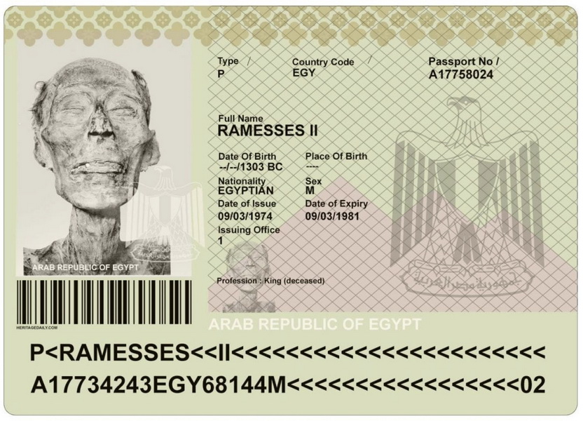 Nel 1976, ai suoi resti fu rilasciato un passaporto egiziano (quasi 3mila anni dopo la sua morte) affinché potesse essere trasportato a Parigi per un trattamento irradiato per prevenire la crescita di funghi “….