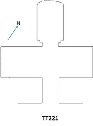 TT221 presenta planimetricamente forma a “T” rovesciata, tipica del periodo costituita da un corridoio di accesso ad una sala trasversale, sulle cui pareti sono riportati brani del Libro delle Porte, il defunto in adorazione di Ra-Horakhti e il defunto e la moglie presentati a Osiride da due divinità.