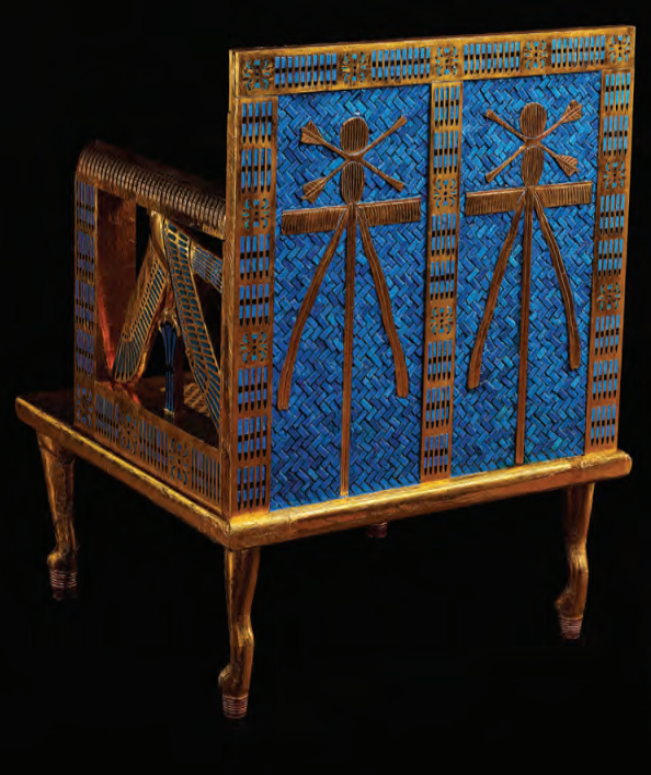 Sul retro della sedia continuava la medesima decorazione, che era riprodotta anche su di una striscia centrale verticale, ai cui lati si trovavano due più grandi emblemi di Neith su di uno sfondo di piastrelle di maiolica azzurra disposte a zig – zag.