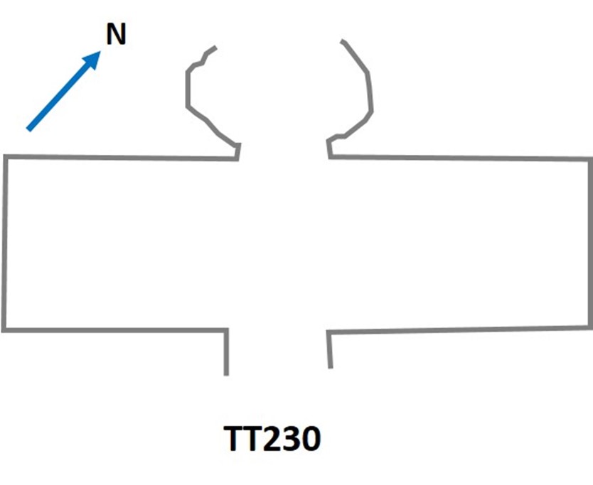 TT230 non è ultimata; planimetricamente si sarebbe sviluppata secondo la forma a “T” rovesciata tipica delle sepolture del periodo. Nella sala trasversale su due registri, resti di scene di banchetto con una pila di vasi, obelischi e un padiglione (?) con tre donne. Sulla parete seguente di nord-est, più corta, Osiride sotto in padiglione[6].