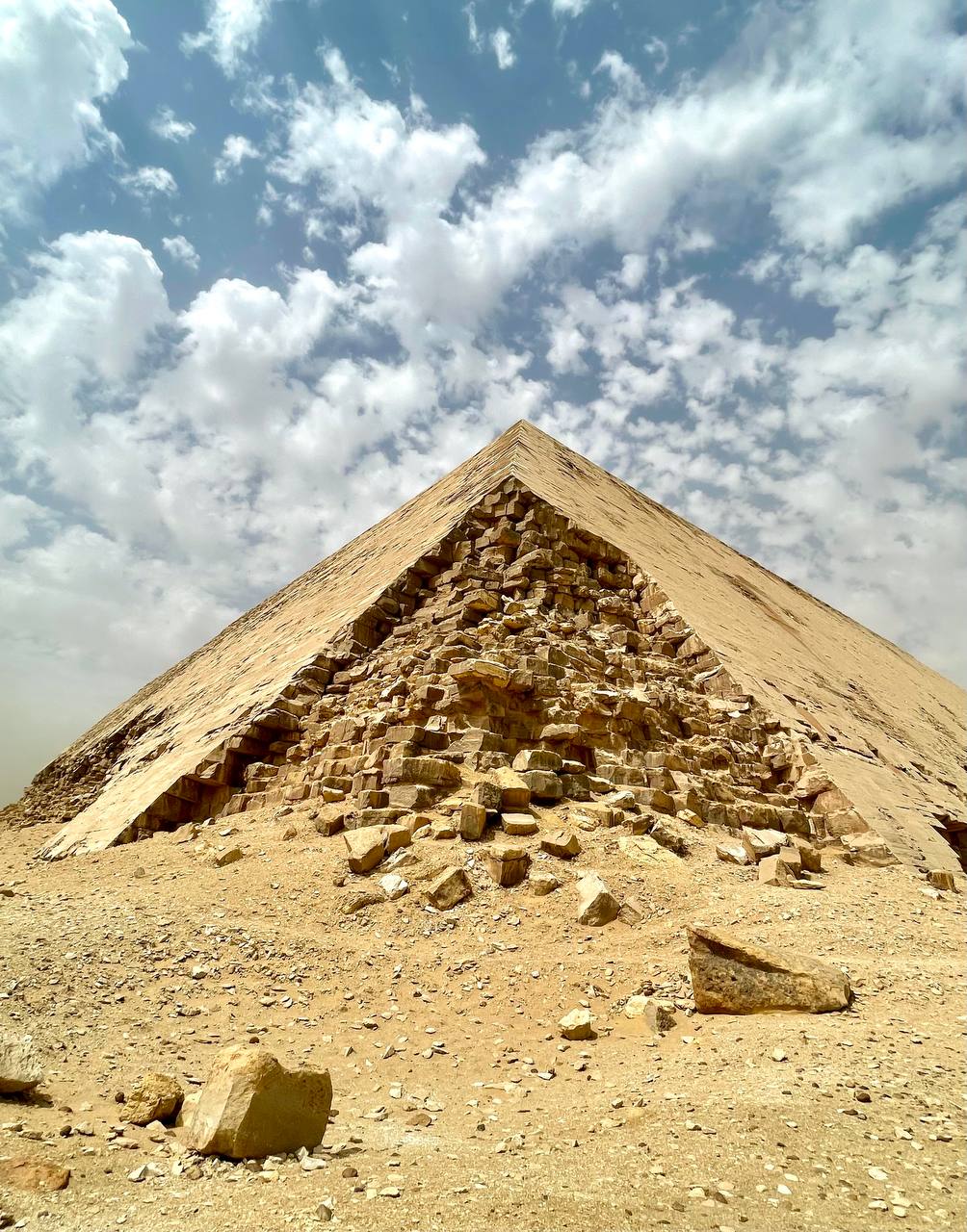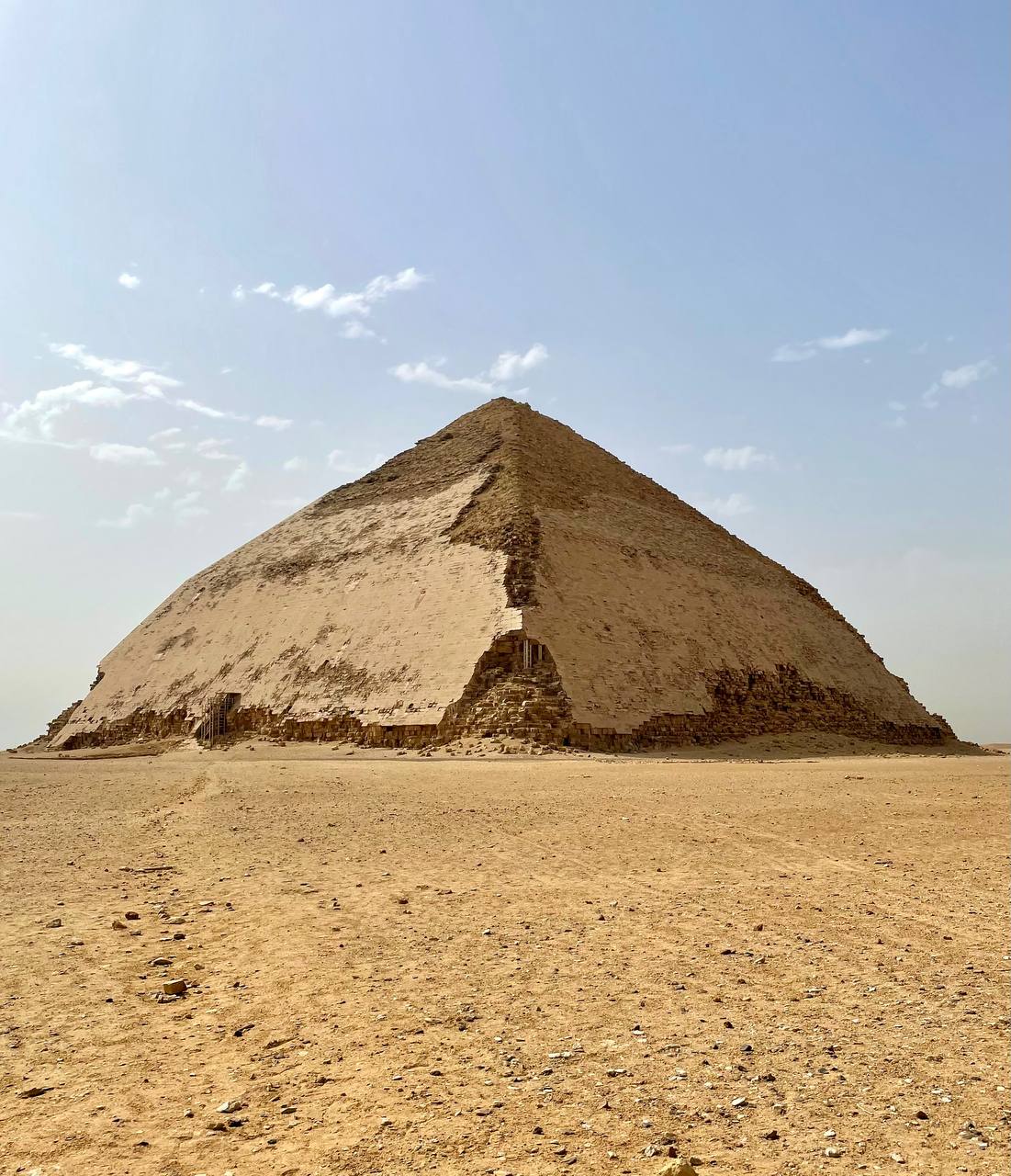 La perfezione della Grande Piramide di Giza si fonda sulle conoscenze acquisite sul campo dagli architetti di Snefru, primo faraone della IV dinastia e padre di Cheope, i quali, prima di raggiungere un buon risultato con la piramide rossa di Dahshur, incontrarono ben due fallimenti, edificandone una a Meidum crollata in breve tempo, ed un’altra di cui parlerò ora, sempre a Dahshur, che li costrinse a correggere in corso d’opera l’inclinazione delle pareti laterali, rivelatesi inidonee a garantire la stabilità dell’edificio che sorgeva su di un terreno friabile e che fin da subito iniziò a presentare pericolose crepe.