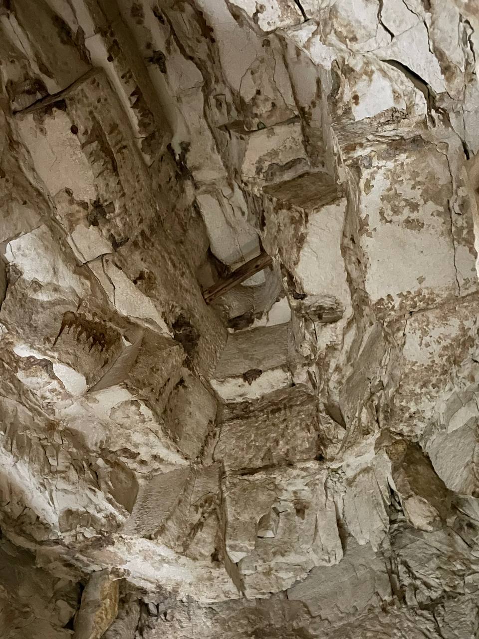 Essa infatti venne costruita con blocchi di pietra molto grandi ed irregolari, ed il rivestimento venne “cementato” sulla superficie per rendere più solide le pareti a rischio cedimento e per lisciarle; l’asportazione delle lastre di calcare diventava quindi molto difficoltoso e fonte di pericolo perché la struttura avrebbe potuto cedere. Foto: Silvia Vitrò