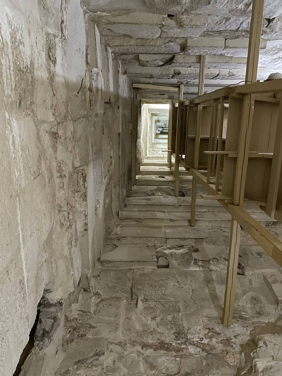 Il corridoio che porta nel cuore della piramide è lungo m. 79,53 ed affonda nel sottosuolo per m. 25; esso è illuminato, dotato sia a destra che a sinistra di comodi corrimano ed è lastricato con assi sulle quali a distanza regolare sono inchiodate orizzontalmente barre di legno che impediscono di scivolare.