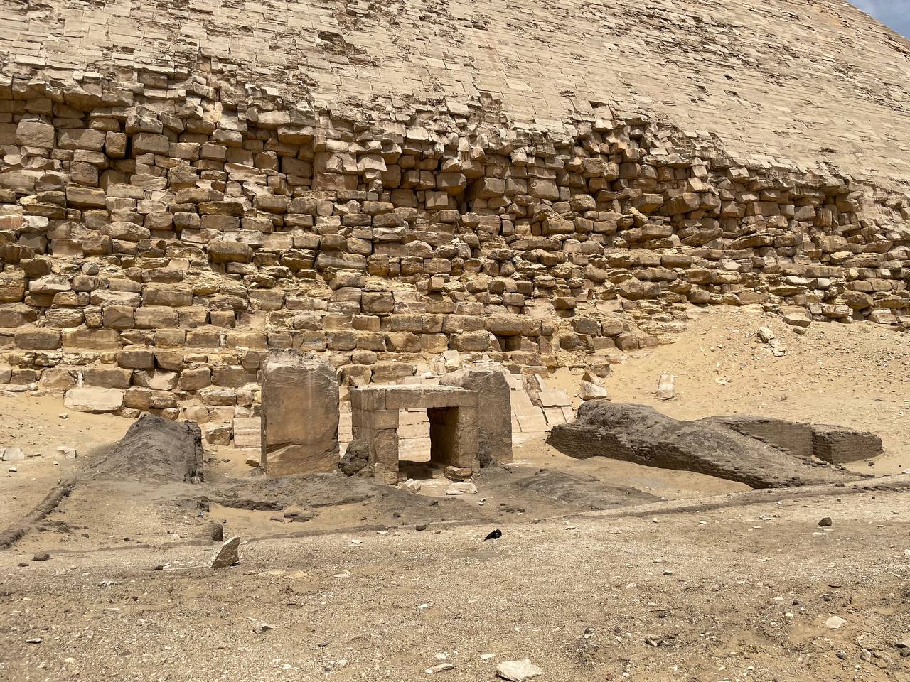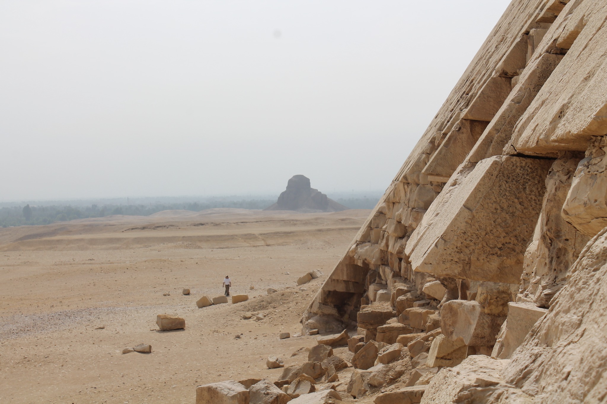 La nostra visita al sito piramidale prosegue lungo il suo perimetro esterno; essa era racchiusa da un ampio recinto quadrato, con lato di m. 299 circa, del quale sopravvivono solo tracce; sul lato sud, a m. 52 di distanza sorge una piramide satellite con rivestimento in calcare bianco oggi praticamente scomparso, sebbene il nucleo dell’edificio sia ancora in buone condizioni.